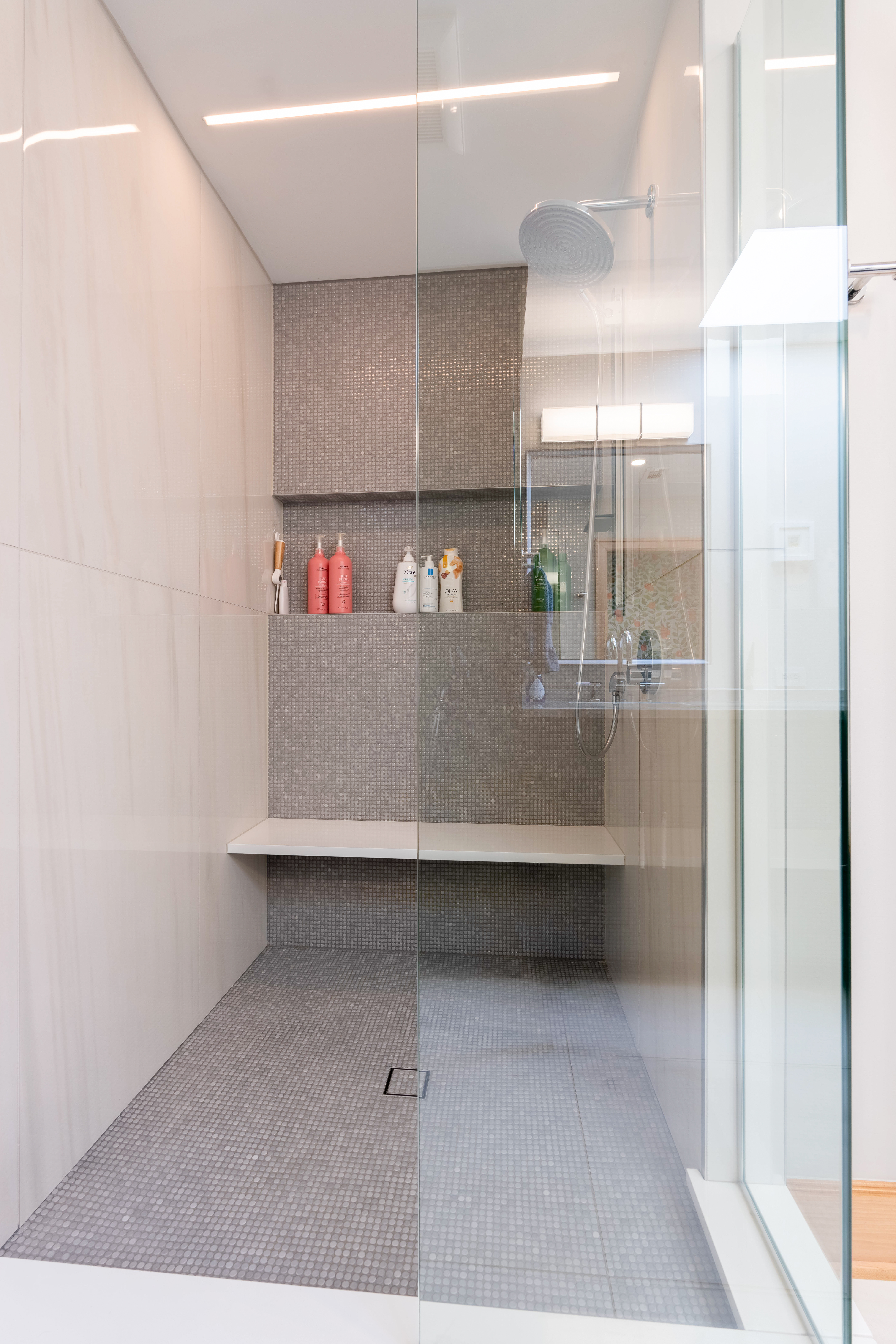 Large-format square floor tiles provide a clean, modern look for the space. In the walk-in shower, two walls feature light white-beige tile, while a third wall has small dark gray tile that continues down to the shower floor, which creates contrast and continuity. A built-in bench enhances comfort, and clear glass doors keep the space feeling open.