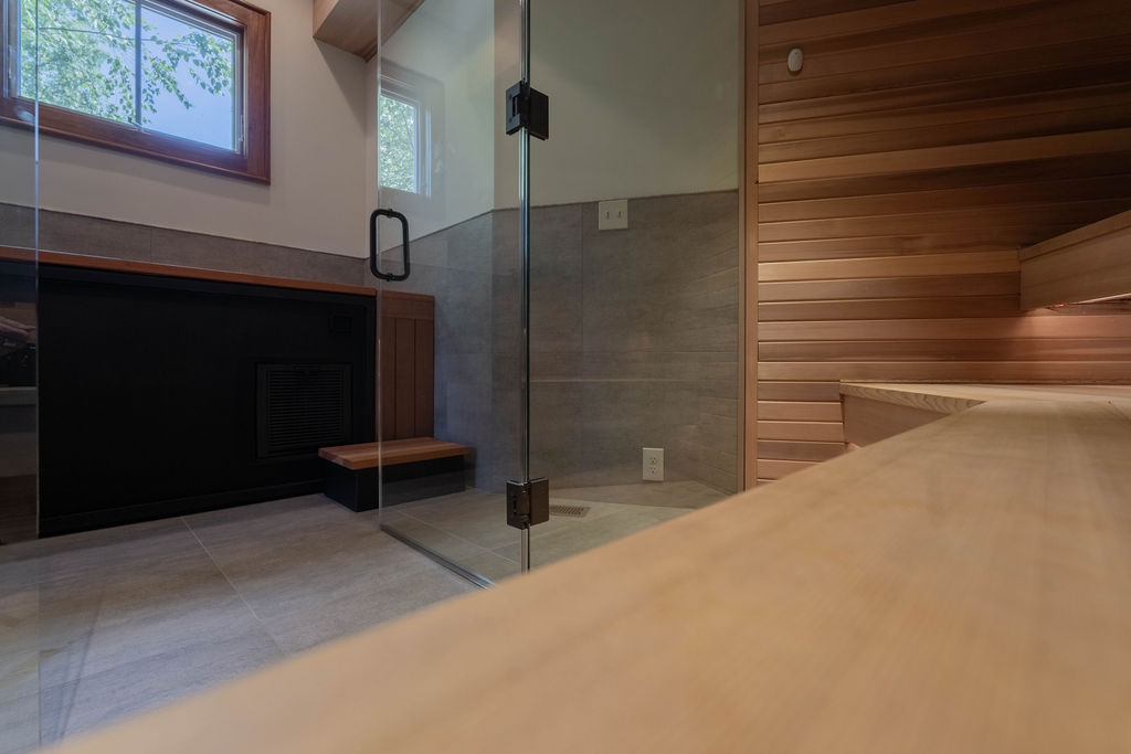 Across the room, the sauna extends the length of the space, featuring smooth cedar wood, under-bench and ceiling lighting that can be dimmed for ambiance, and a professional-grade hot rock system for precise temperature control.