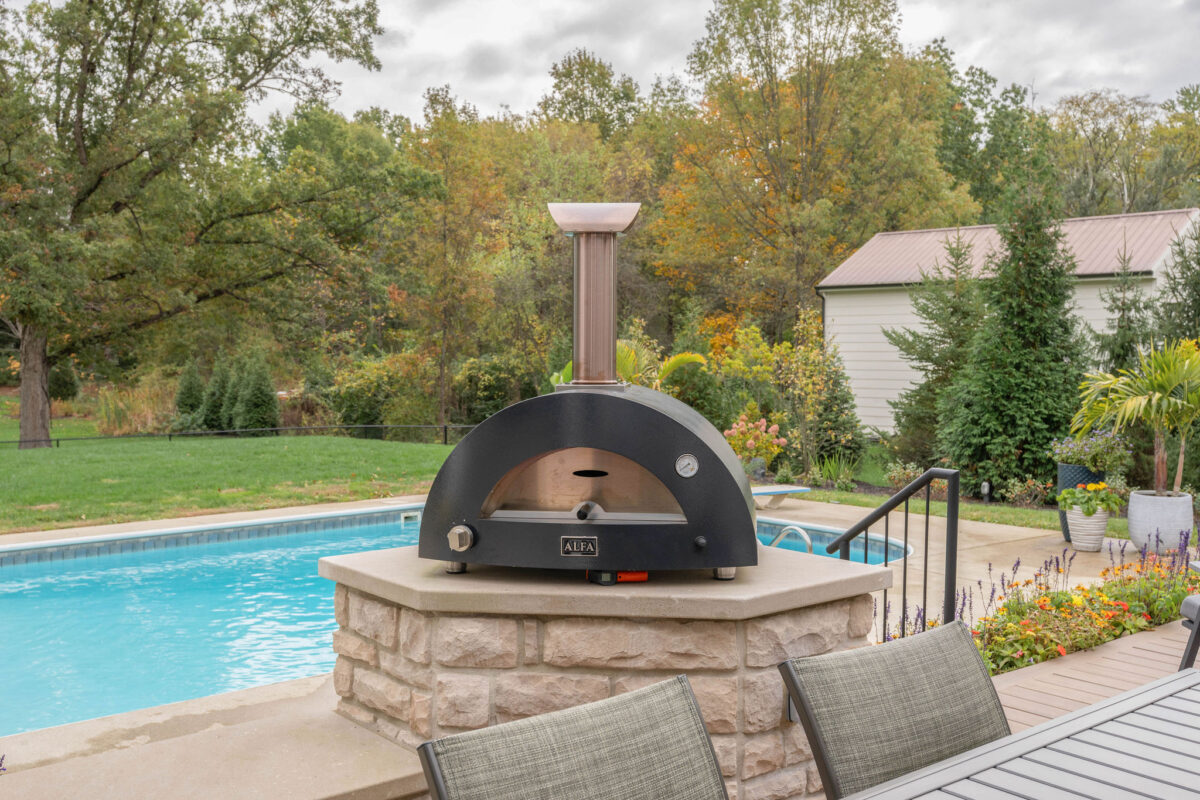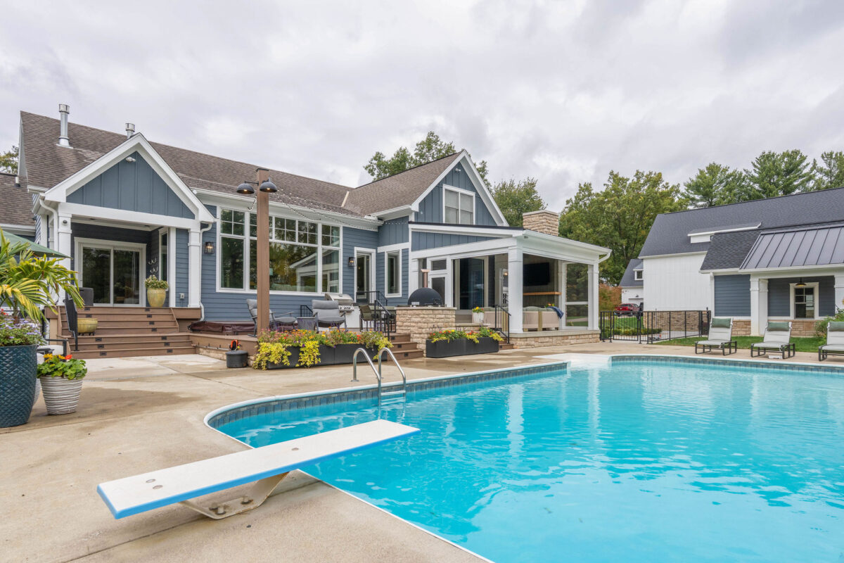 View more of this recent exterior renovation in New Albany, Ohio featuring a pool, three season room, high-end lighting, and yes, even a pizza oven!